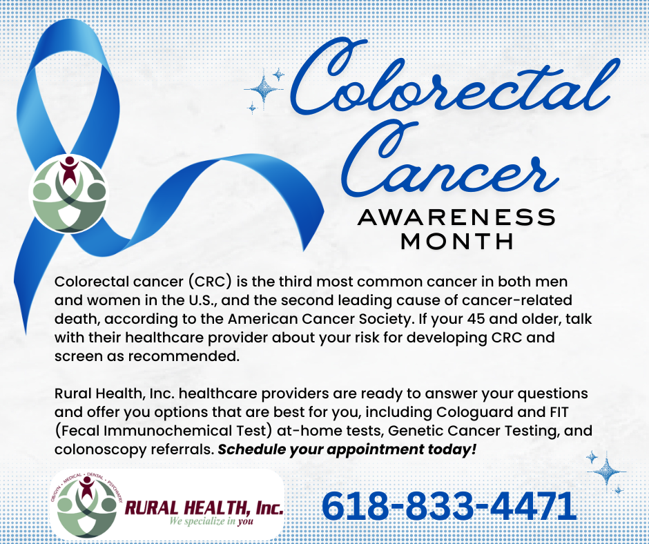 Rural Health, Inc. healthcare providers can help you screen for CRC by offering Cologuard, FIT, Genetic Cancer Testing, and determining your risk factors. To learn more, or to schedule an appointment, call 618-833-4471 or visit www.ruralhealthinc.org. For more information on the American Cancer Society, visit www.cancer.org.