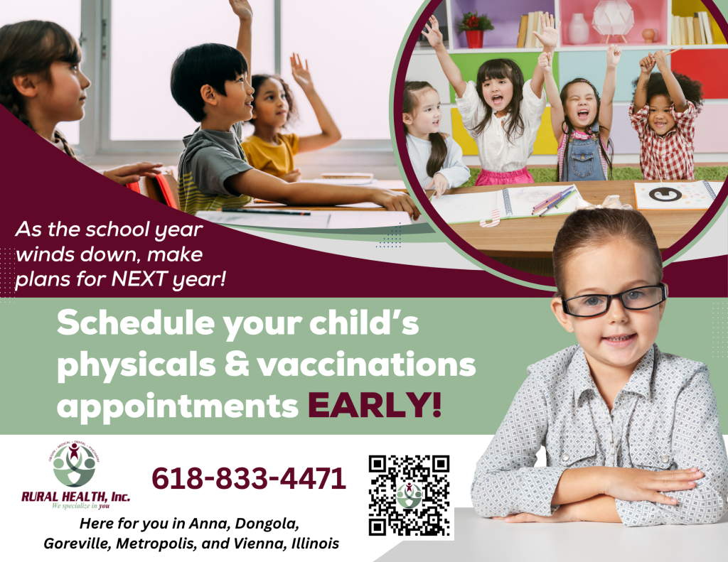 For questions regarding your child’s back-to-school requirements or to schedule an appointment, call Rural Health, Inc. at 618-833-4471 or visit www.ruralhealthinc.org.