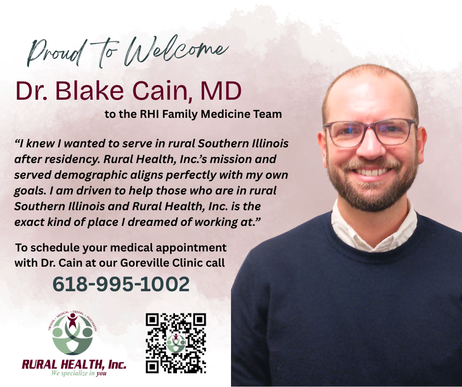 Rural Health, Inc. (RHI), a family medical clinic providing quality medical, OB/GYN, dental, and behavioral health care for the region, proudly announces that Dr. Blake Cain, MD, has joined its medial office in Goreville, Illinois; bringing an extensive background in family medicine for residents of Johnson County and the surrounding communities.
